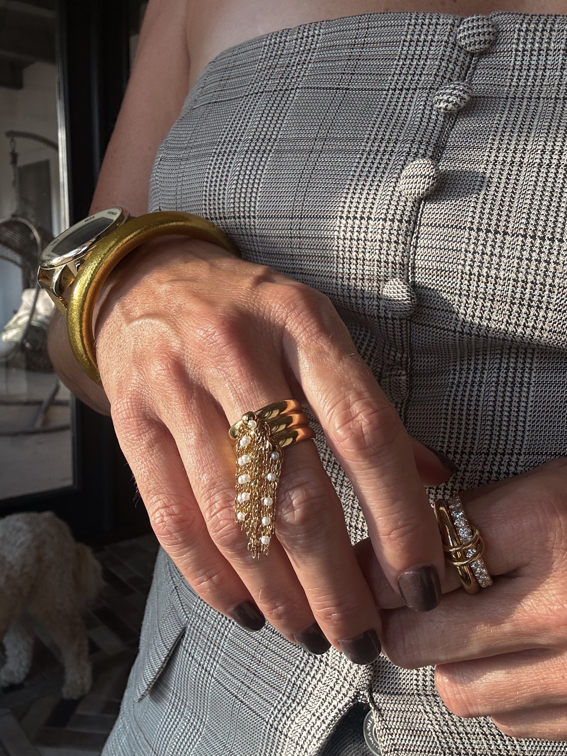 •Water Resistant anti-tarnish adjustable ring with pearl dangle detail.
